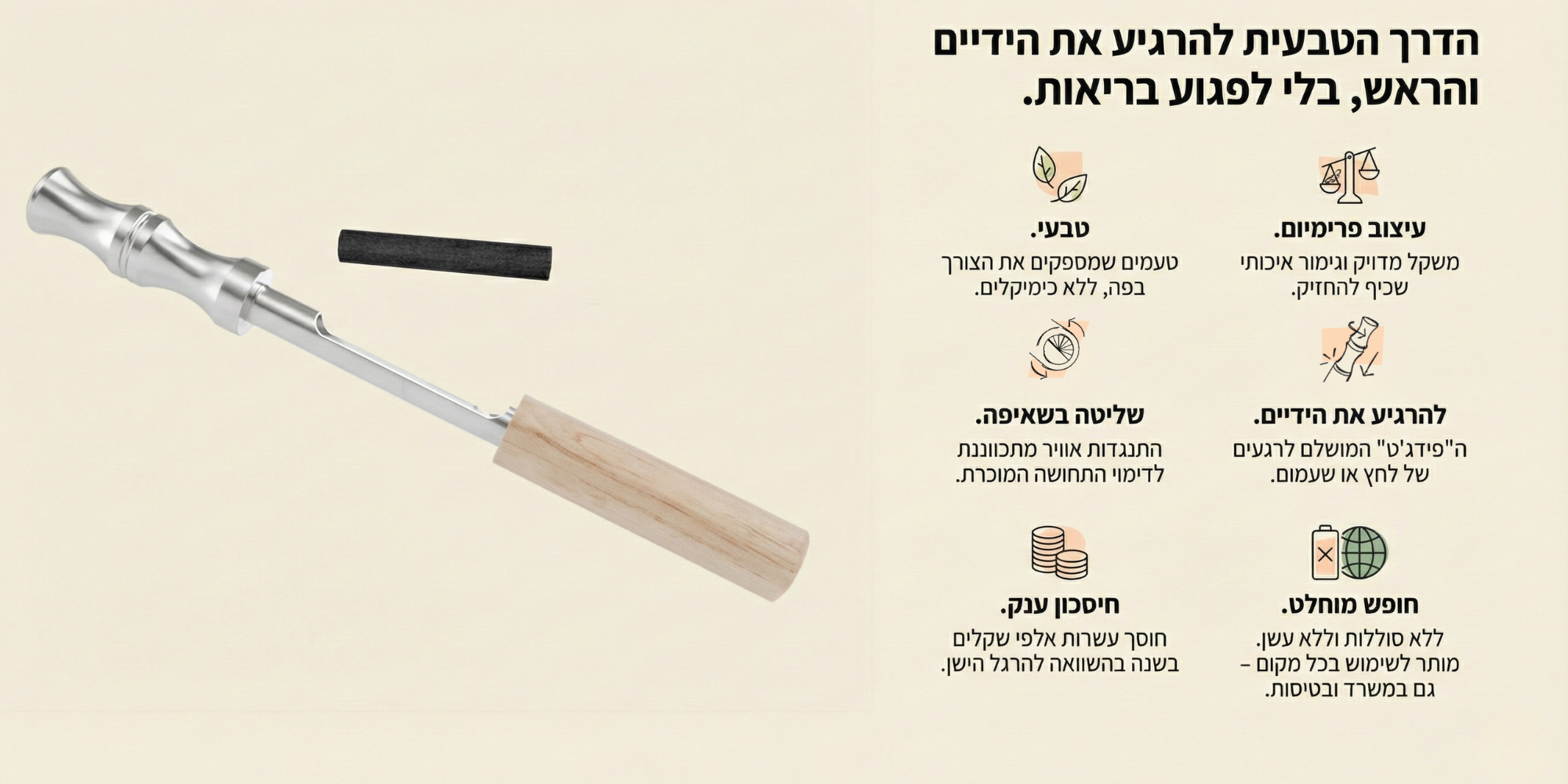 המשאף : גוף המכשיר חרוט מבמבוק טבעי מלא למגע נעים, בשילוב ליבת פלדת אל-חלד שמבטיחה עמידות וסטריליות מקסימלית.